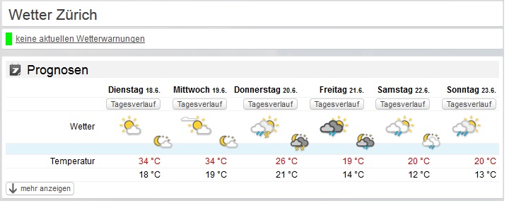 A finales de la semana pasada estábamos en torno a 26-27° C y estos días rondamos los 34° de máxima, pero los 18-19°C de mínima. De estos seis veranos que llevo en Suiza, este junio es sin duda el más cálido. Pero volverá a refrescar a partir del jueves.