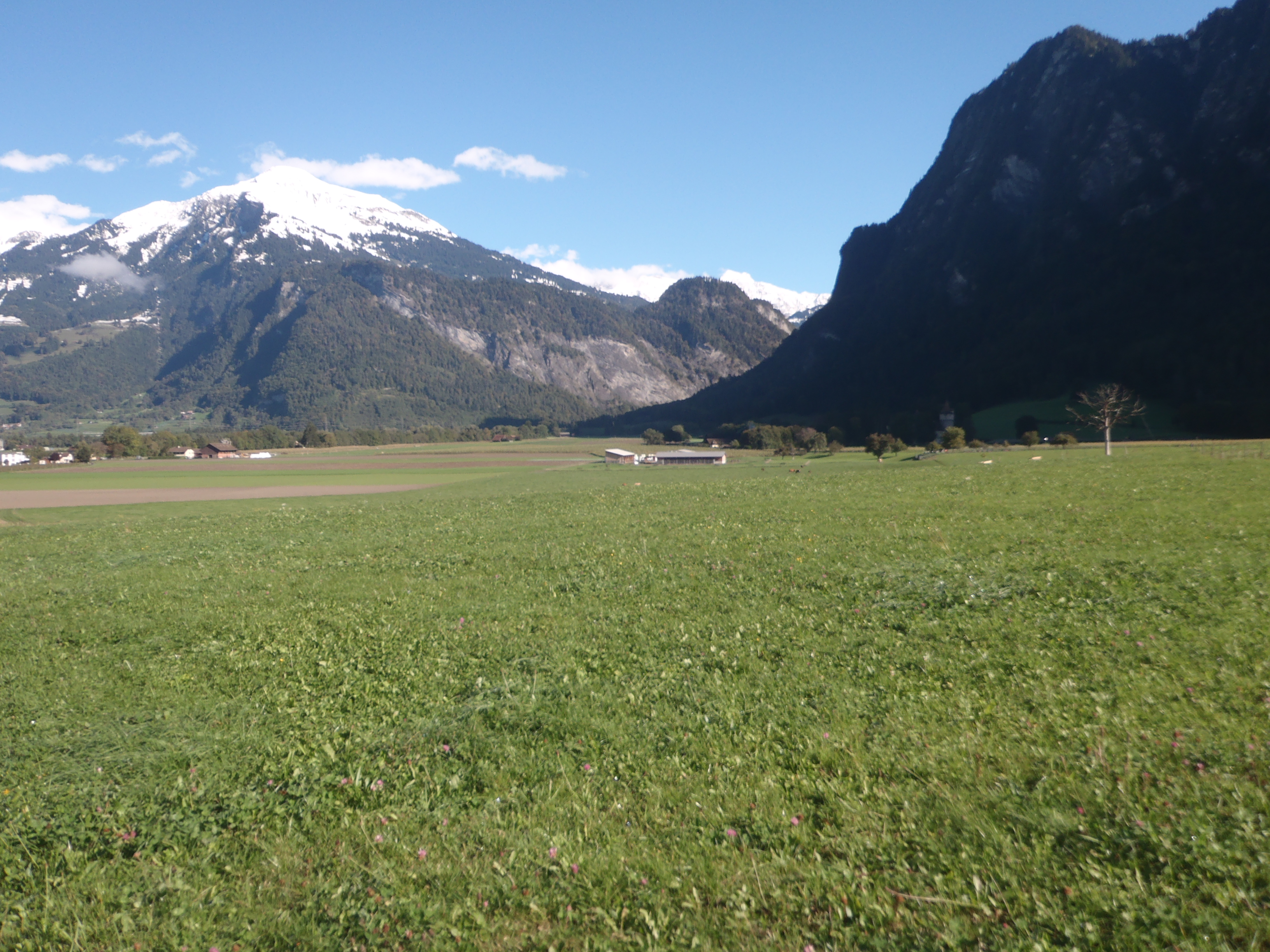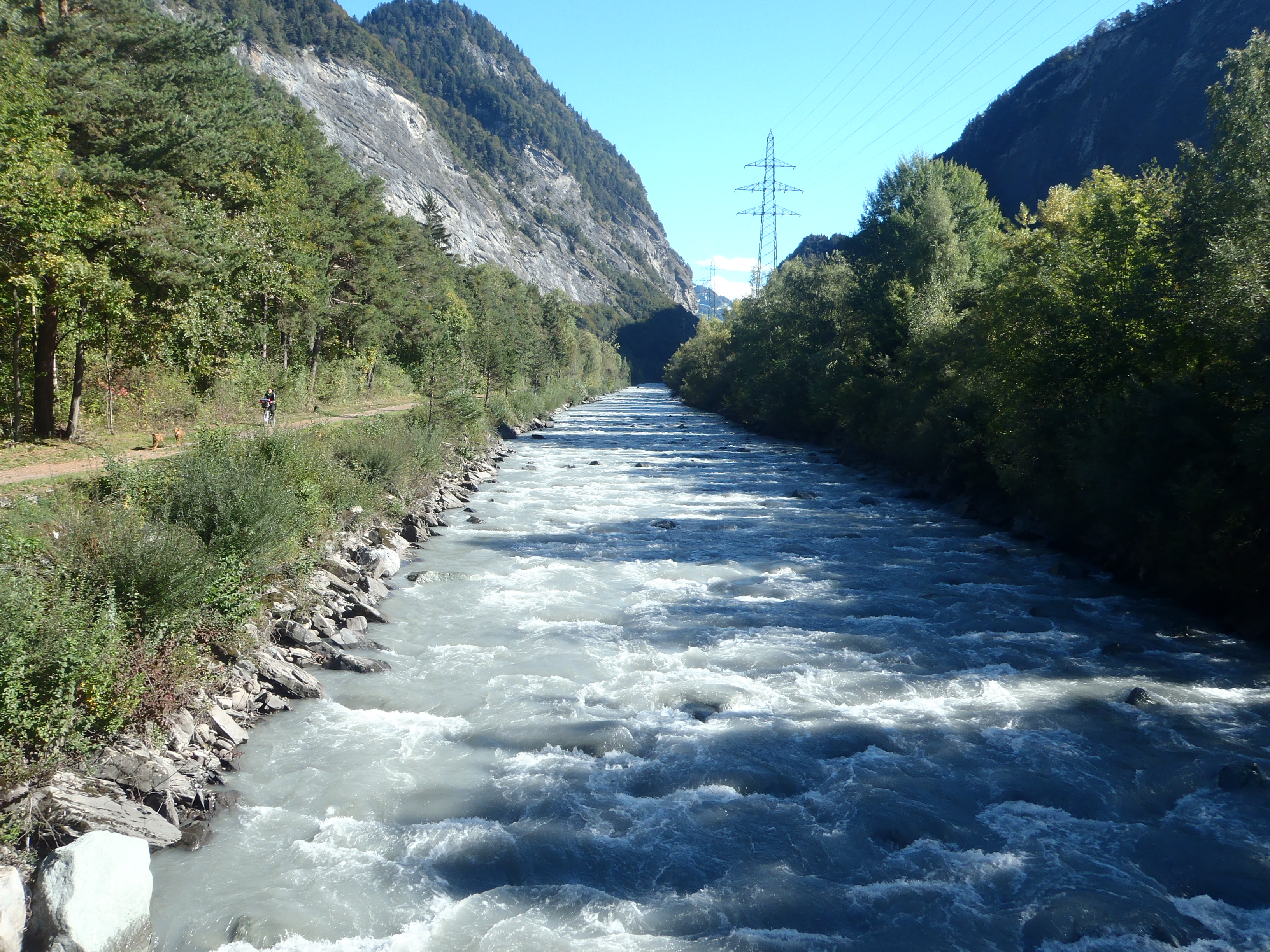 OLYMPUS DIGITAL CAMERALlegamos al río Landquart y a mano derecha, detrás del valle distinguimos apenas un pico nevado (y puede que sea la cima de una de las montañas que separan Suiza de Austria, quizás el Sulzfluh de 2.800m o el Schjenflue, de 2.670 m).