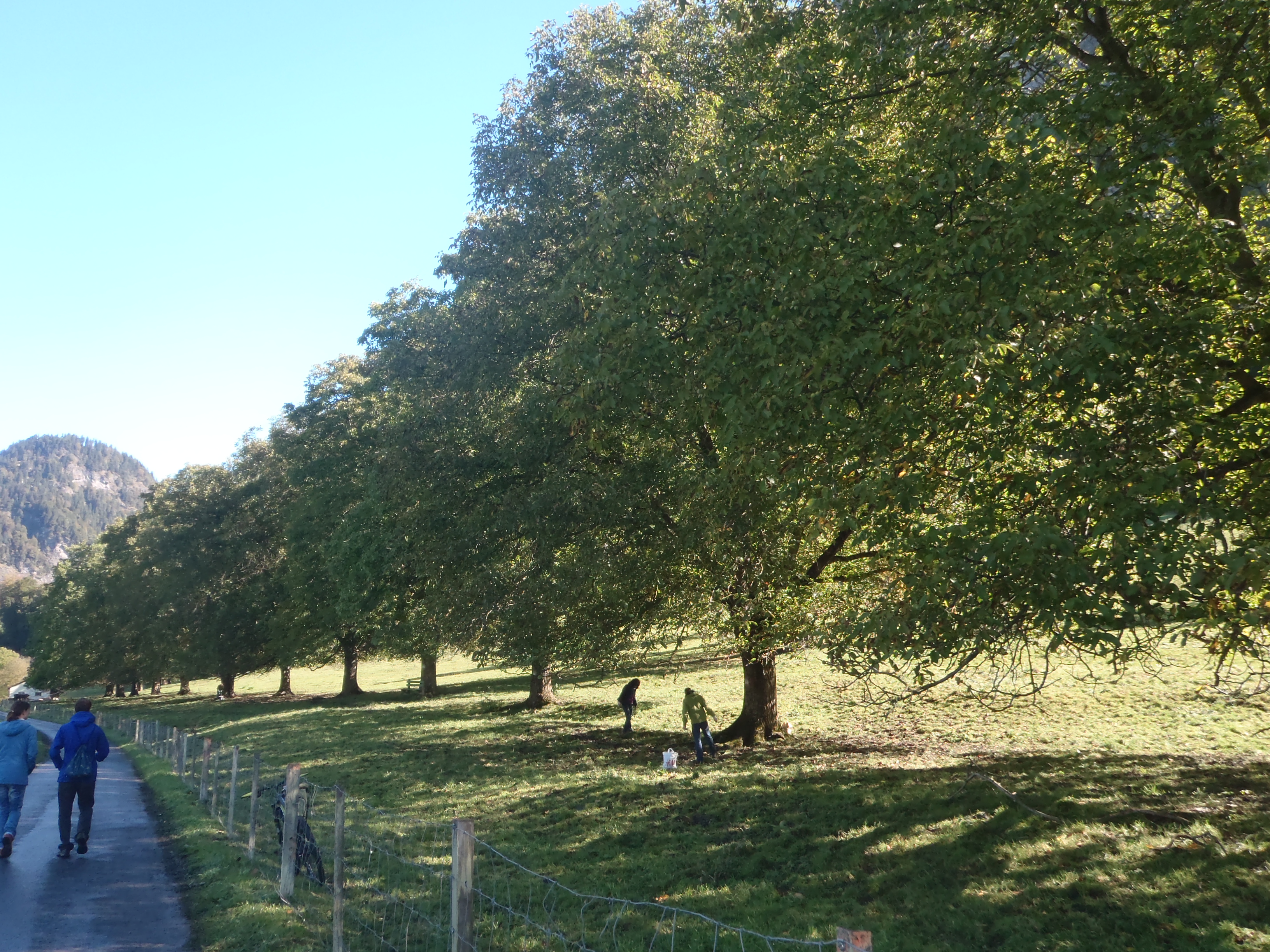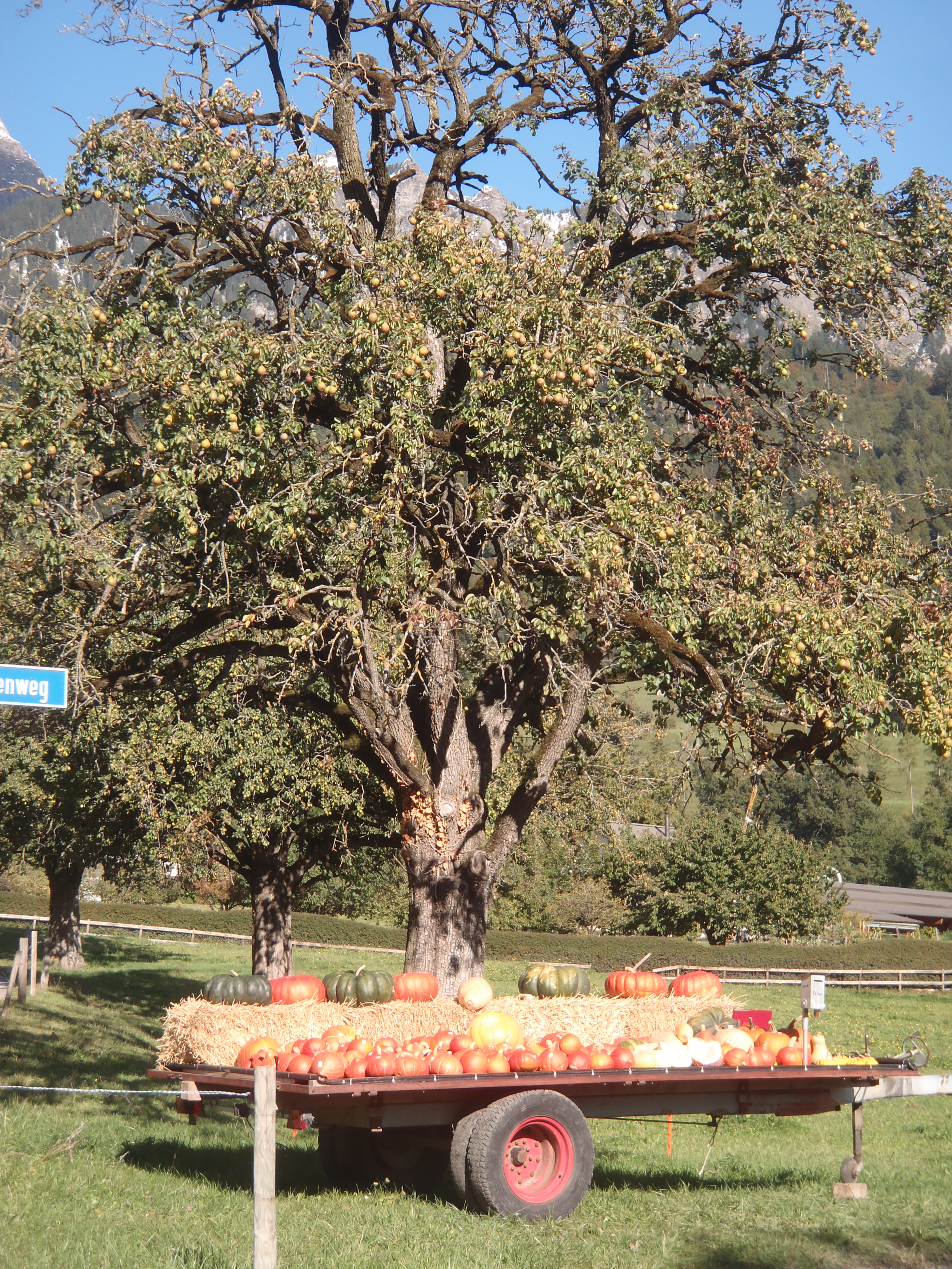 A la vuelta compramos calabazas en los puestos tradicionales, que no están atendidos por nadie. Hay una hucha haciendo de caja, y nosotros dejamos el dinero justo de aquello que compramos. En esta ocasión sólo hay calabazas, otras veces vemos huevos, manzanas, miel, mermeladas caseras, etc… Con este ejemplo te puedes hacer una idea de lo honrados que son los suizos.