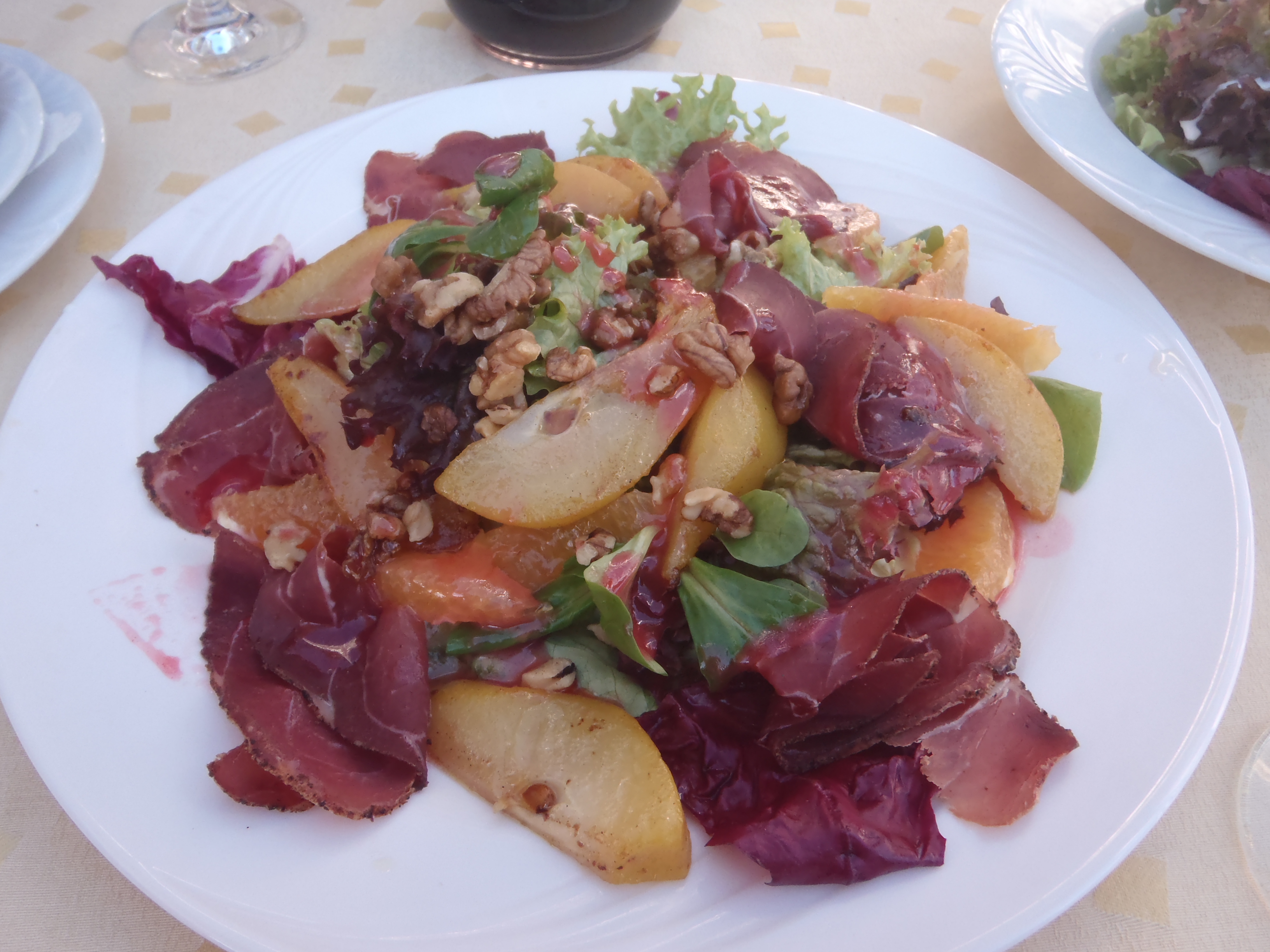 La gastronomía de la región estaba reflejada en la carta: carne de caza (ciervo, jabalí), pizokel, castañas, vino y mosto, etc. Mientras la mayoría se decantó por las sopas o ensaladas mixtas, yo elegí una ensalada de otoño: lechuga, pera confitada, naranja, carne de jabalí curada y nueces, aliñado con un vinagre de frambuesa. No hay palabras para describir el sabor. Espero que la foto del plato ayude.