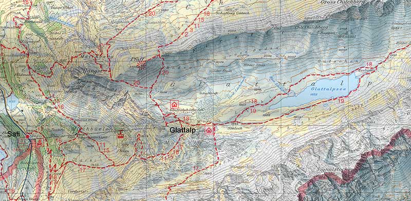 Una ruta corta para hacer entre mayo-junio y octubre-noviembre (sin nieve). El lago de Glattalp está en una hondonada en la montaña, en el término municipal de Muotathal, en el cantón de Schwyz. Es conocido por que en invierno se registran temperaturas mínimas récord. El 7 de febrero de 1991 se registró la temperatura mínima de -52.5ºC, récord en toda la historia de Suiza. Aunque normalmente en invierno ronda los -30ºC