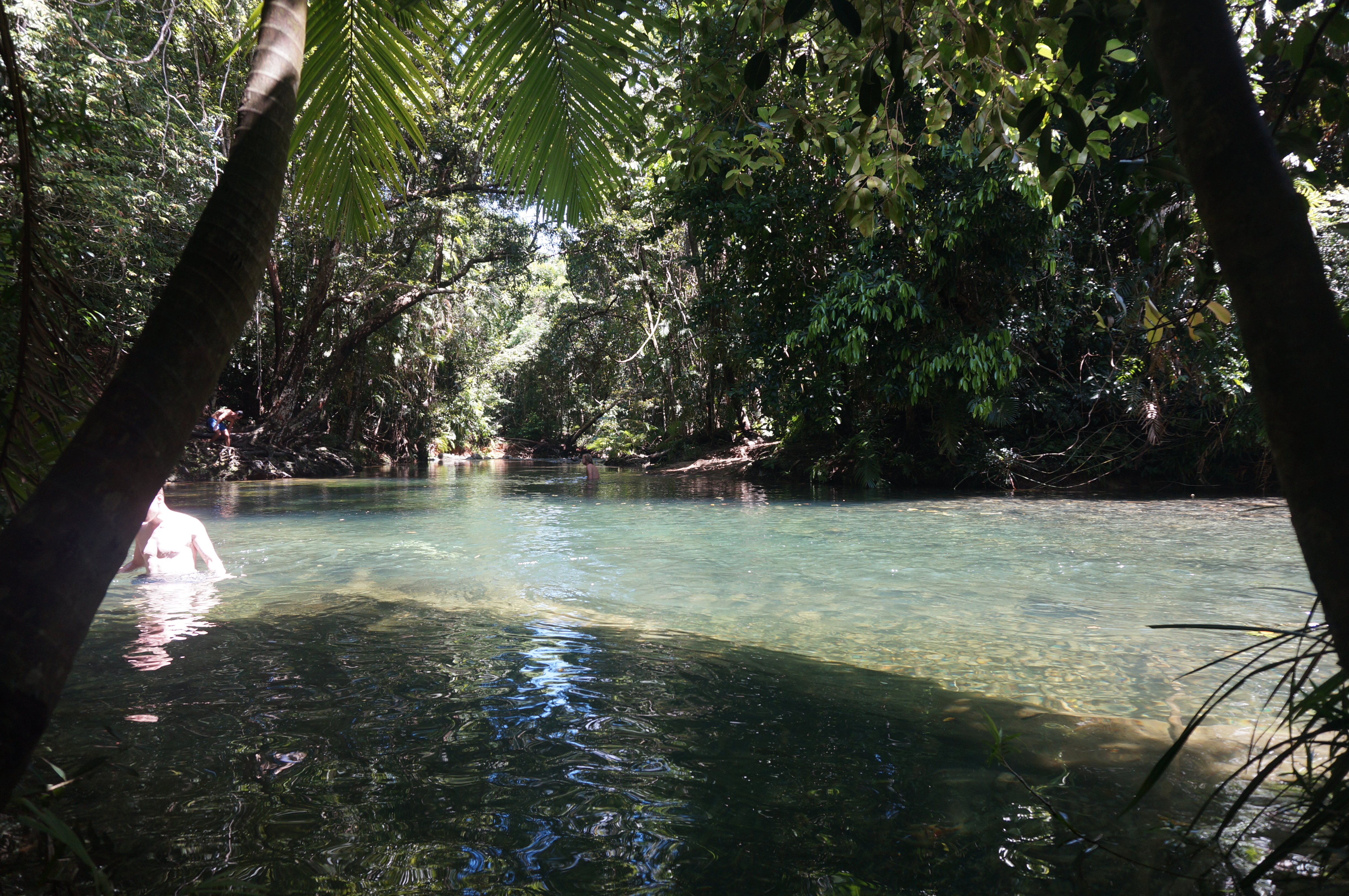 Sólo pudimos bañarnos en el Swimming Hole, al lado de la cafetería Mason en Cape Tribulation. Aguas cristalinas y frías que te devuelven a la vida en un día de 35°C.