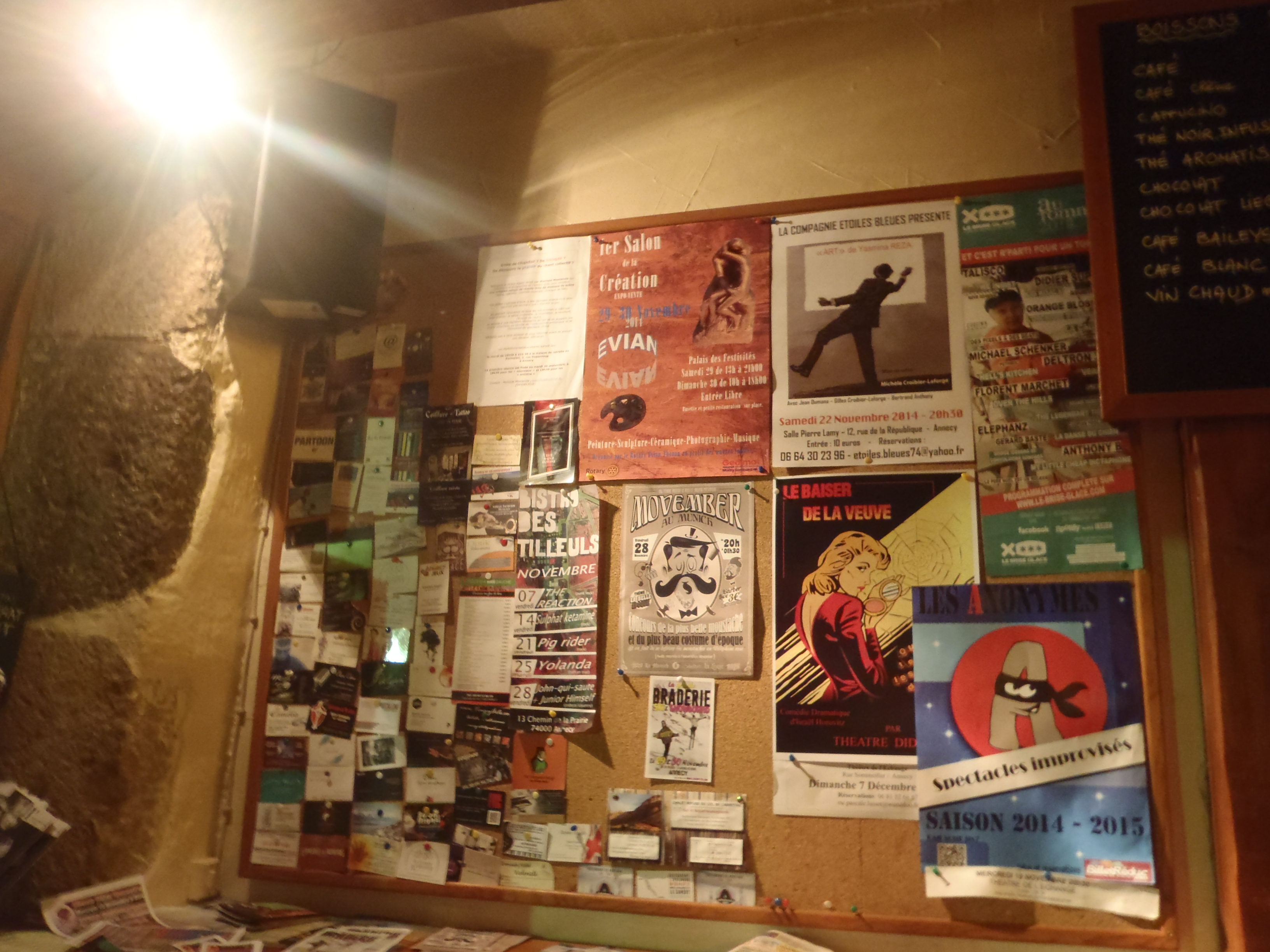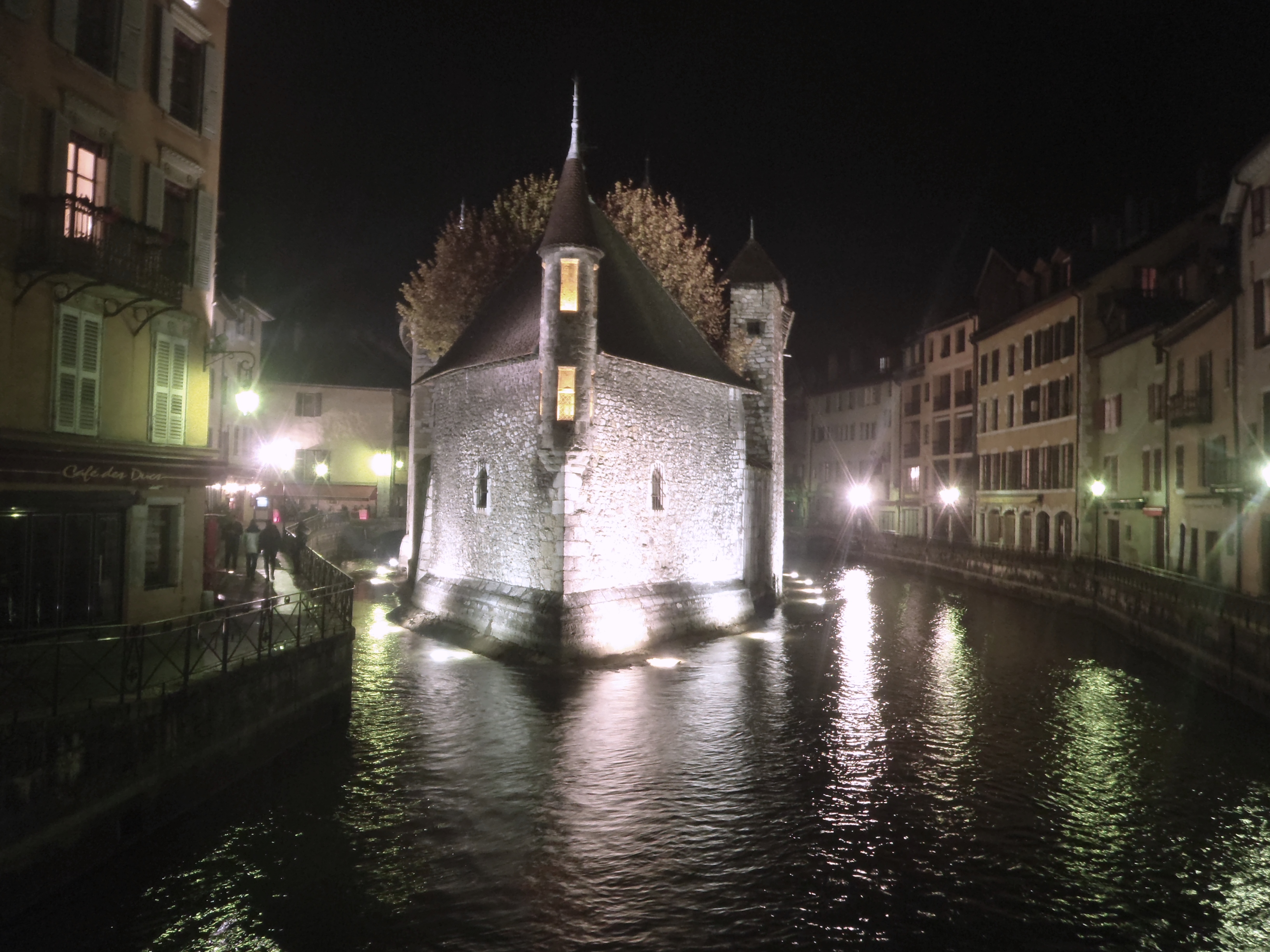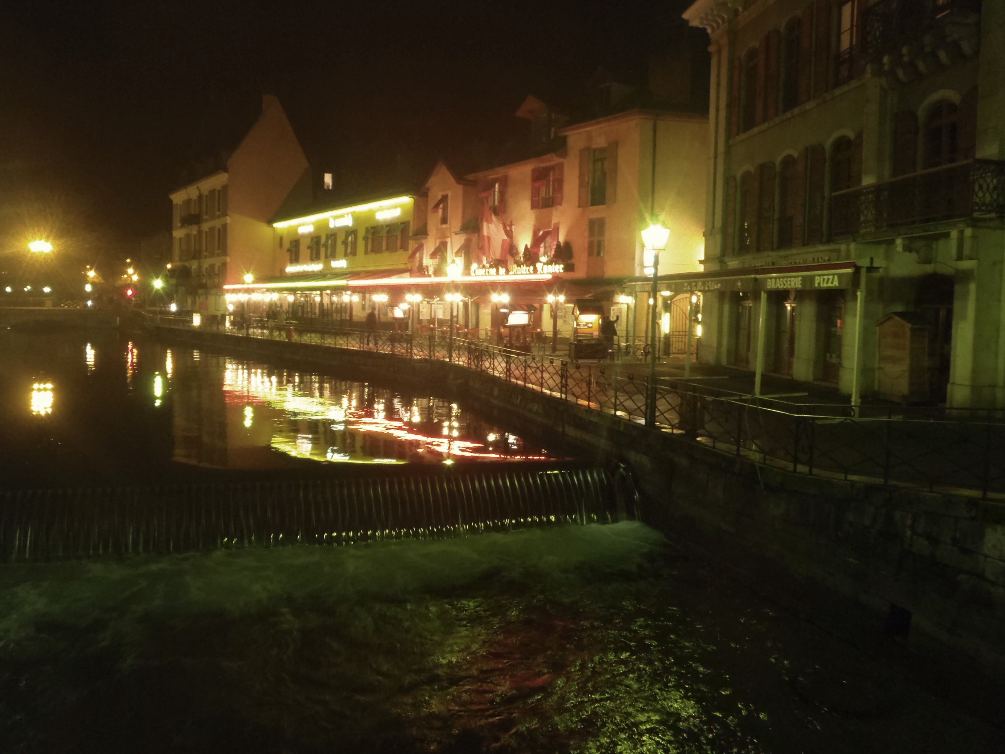 Cuando nos pusimos a dar vueltas como zombies, porque tres de nosotros empezábamos a tener hambre, muchísimas crêperies, varios restaurantes, etc. nos rechazaban la entrada, bien por estar llenos y no tener mesa para nueve, bien porque su cocina cerraba a las 21.30h. Claro, siempre vamos con mentalidad española y luego pasa lo que pasa. Pero no salió tan mal la jugada después de recorrer varias calles (St.Claire, L’ìle) y preguntar en varios sitios, llegamos hasta Quai Perrière y cenamos en un restaurante que no aparece en la guía tripadvisor. Está justo al lado de la cervecería Munich, y tienen pizzas, pero muchos platos típicos de Saboya: terrinas, tartiflette (un plato de queso, patatas, jamón y cebolla gratinado), pescados (perca y minipescaditos que sabían a boquerón -joël o Athérines) y de postre el café gourmand (un café espresso, mousse de chocolate, tiramisú y panna cotta servido en vasitos pequeños). Los precios estaban entre los 15/35 euros los platos, o alguna combinación de menú.