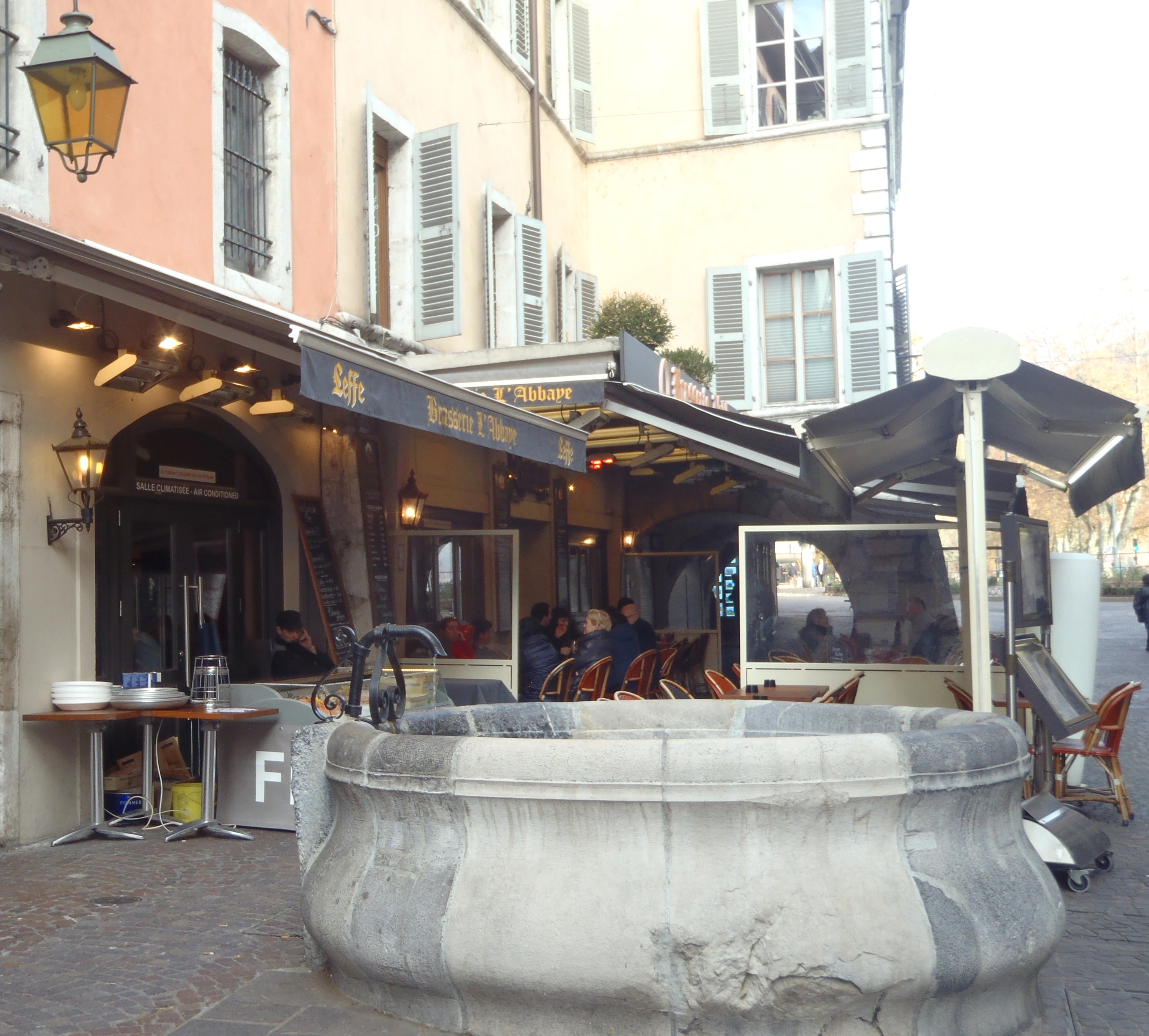 Callejeamos todo lo que pudimos y cuando de nuevo el hambre nos exigía buscar una mesa, encontramos la Brasserie l’Abbaye. Aquí las cervezas eran belgas, y la gastronomía era franco-belga. Habían muchas especialidades de Saboya, pero también los riquísimos Moules et frites: mejillones con patatas fritas.