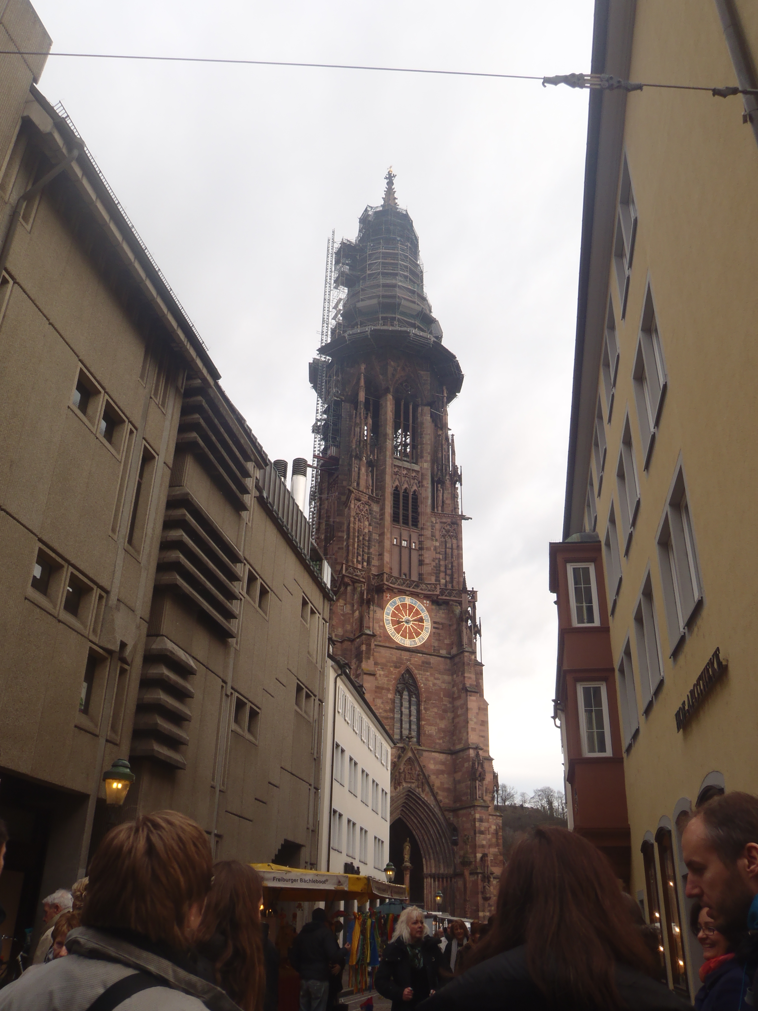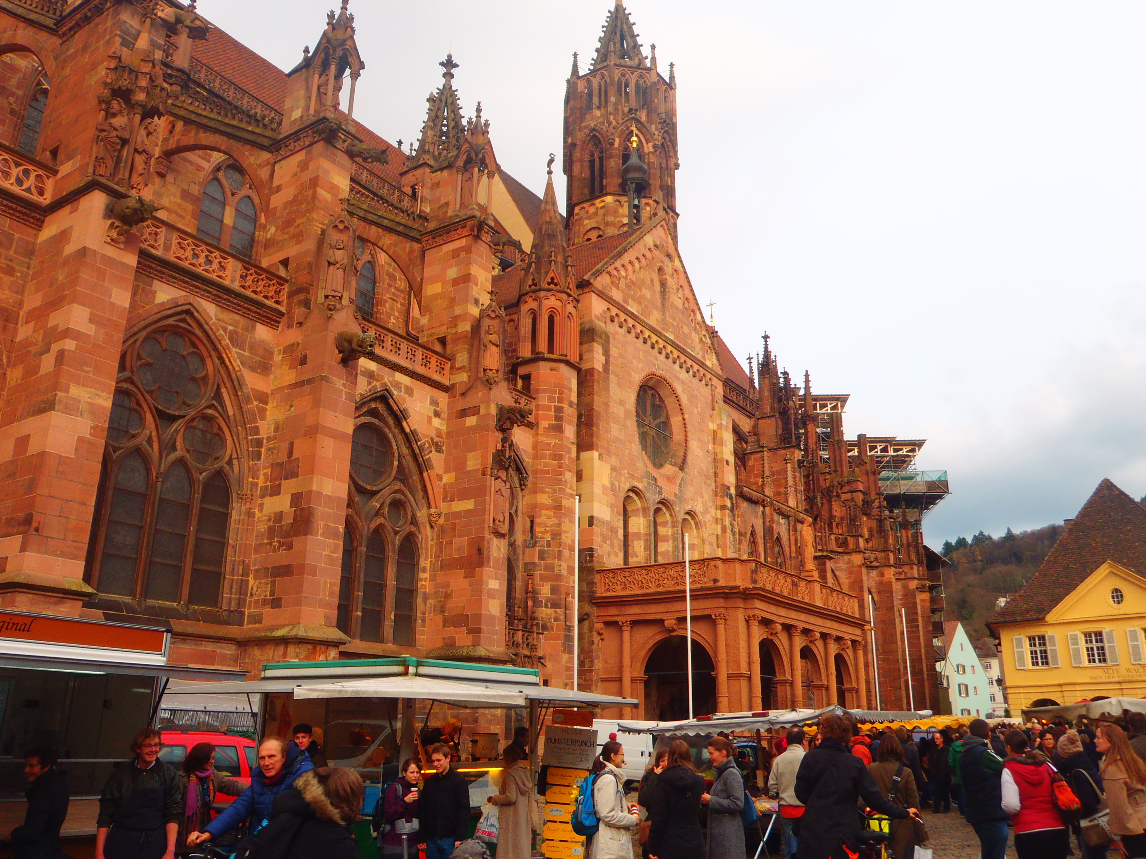 Otro monumento espectacular es la catedral o Münster, y el bonito mercadillo de frutas, verduras y artesanía que había en la Münsterplatz. La catedral es de estilo gótico, destaca por el color rojizo de sus paredes y su campanario, que sigue en obras, de 116 metros.