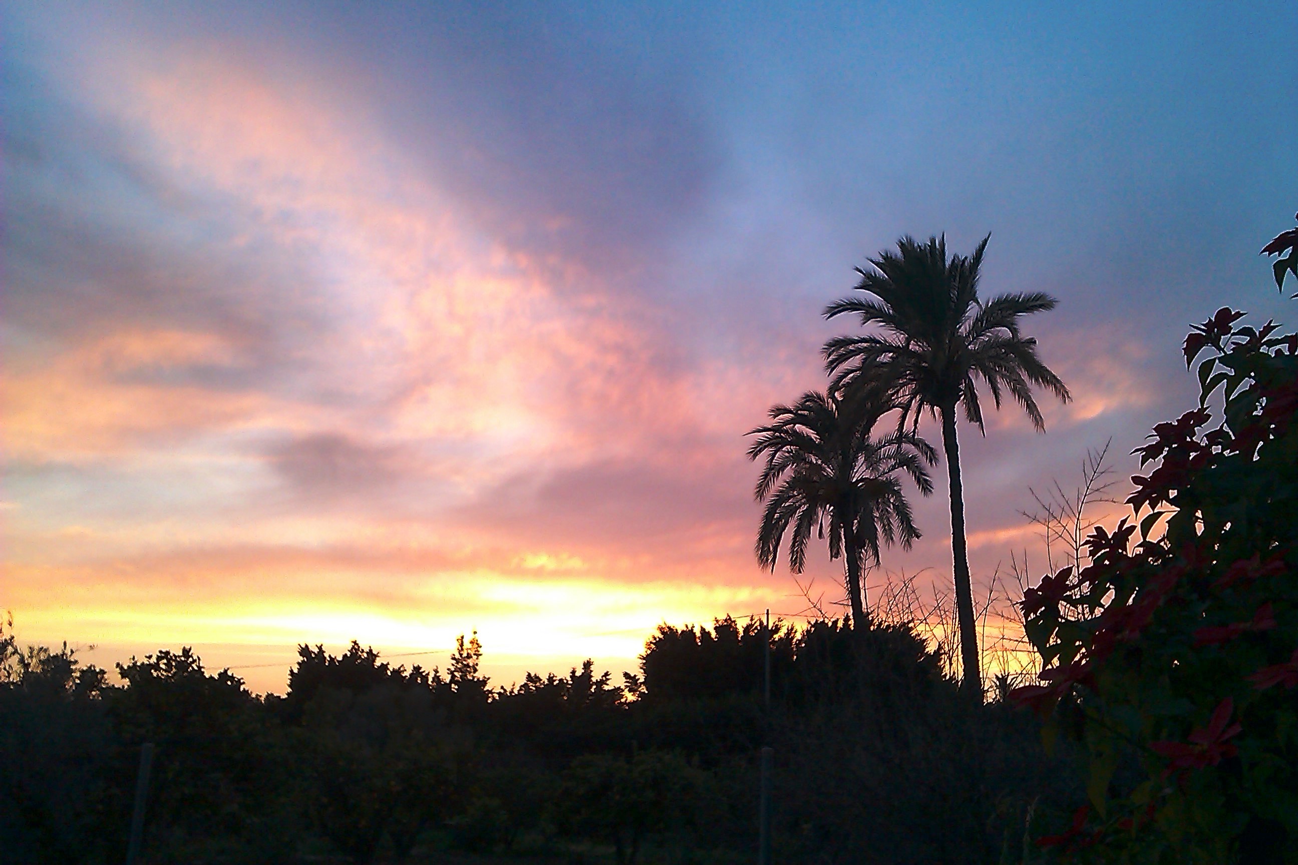 un atardecer en la terreta, sobre naranjos, flor de pascua y palmeras