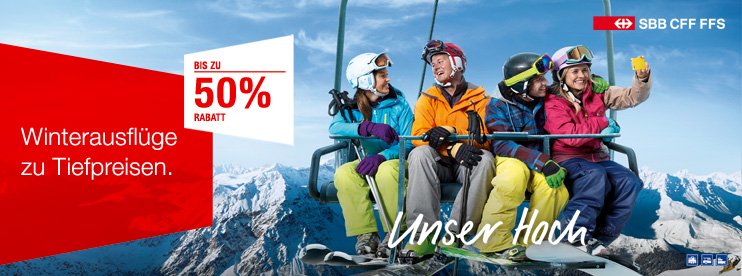 Para ir  a esquiar o simplemente ir a pasar el día en la nieve, informaos antes de las ofertas de tren de la SBB. En esta ocasión tienen una oferta del 50% para ir a esquiar a Airolo, y un 30% para hacerlo por ejemplo en Disentis, o para subir el tren Voralpen Express.