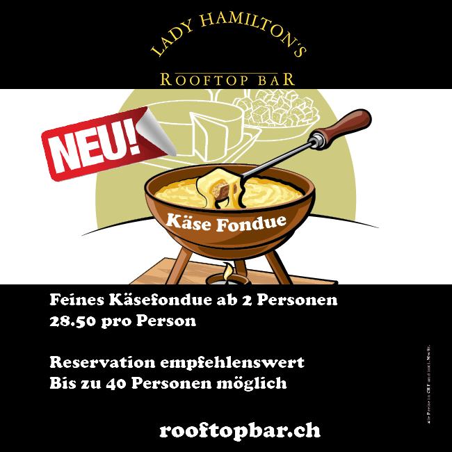 Conocéis Lady Hamilton en Zúrich? Proponen que vayas a su terraza, la misma que en verano servía para tomarte esa cervecita después del trabajo, pues ahora para disfrutar de una fondue. Os pongo la información aquí para los amantes del queso (28.50 CHF):