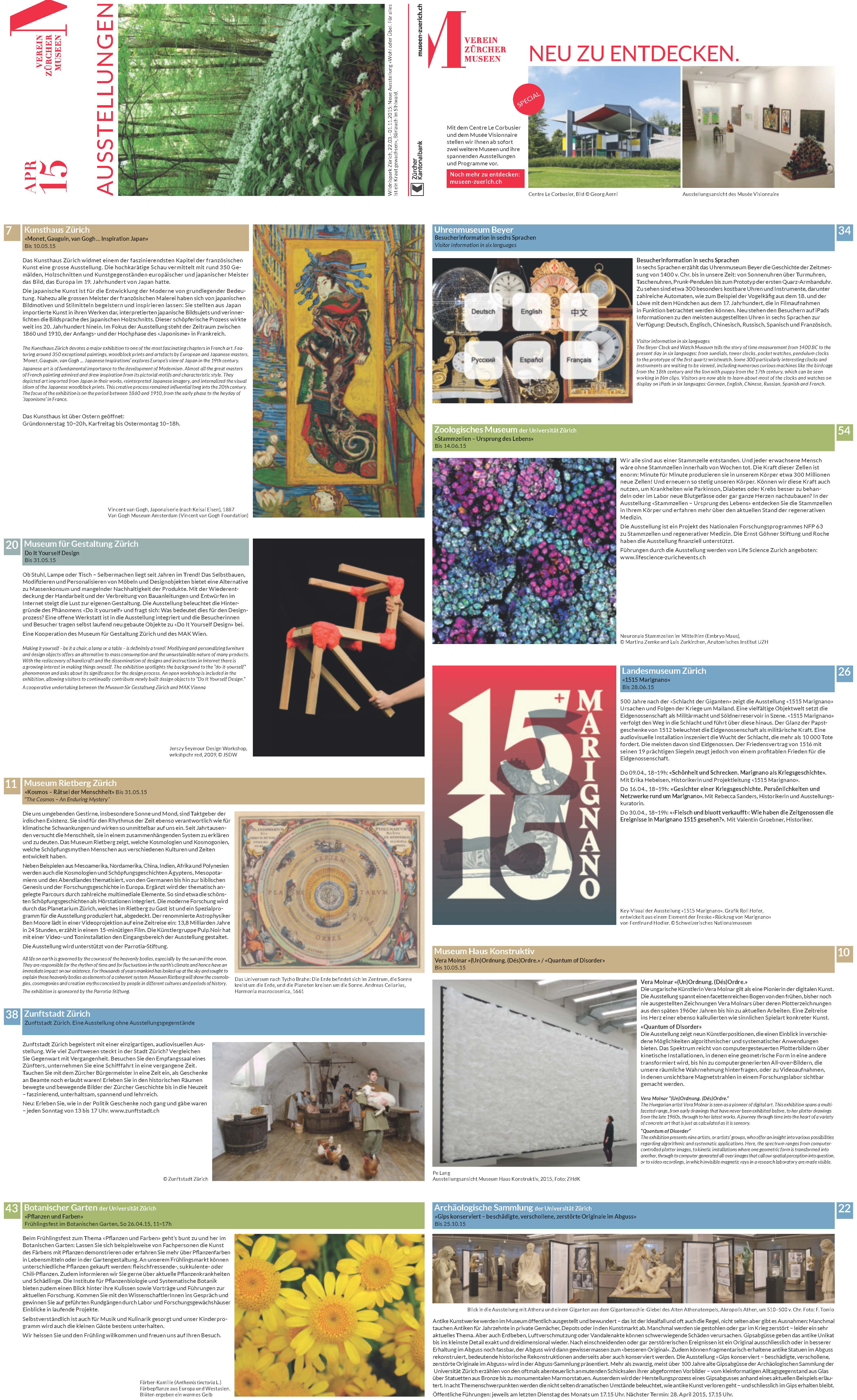 Bulletin_April15_Web o podéis mirar aquí en la web. Hay para todos los gustos y bolsillos. Recordad que los lunes la mayoría de museos están cerrados (no todos, aunque siendo lunes de pascua y festivo, hay que consultar antes los horarios y días de apertura: estarán abiertos con total seguridad: el Zoo, Wildnispark, Sukkulenten-Sammlung, Botanischer Garten, etc).