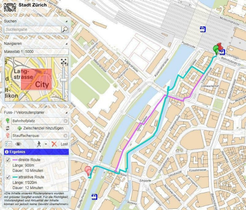 Una de las pocas cosas gratis que existen en Zúrich es poder pasear en bicicleta. La ciudad dispone de 340 km de calles en las que los ciclistas podemos circular de forma segura. 170 km de los cuales están señalizados como carril bici. De hecho la ciudad pone a disposición de los ciclistas un mapa interactivo en el que planear la ruta (Routenplaner) que quieras hacer.