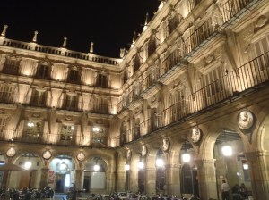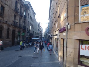 El vuelo a Madrid sin incidencias y un tren desde Chamartín a Salamanca en el que me congelaba por el aire acondicionado se llevaron buena parte del viernes. Aún así mi amiga y yo pudimos comenzar a recorrer las empedradas calles de Salamanca. Arrastramos nuestras maletas, oyendo el traqueteo de las ruedas y llegamos a la Plaza Mayor.