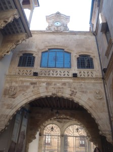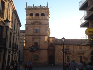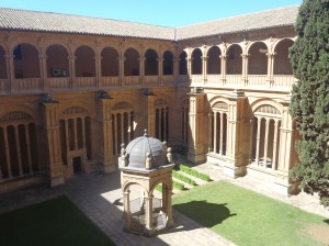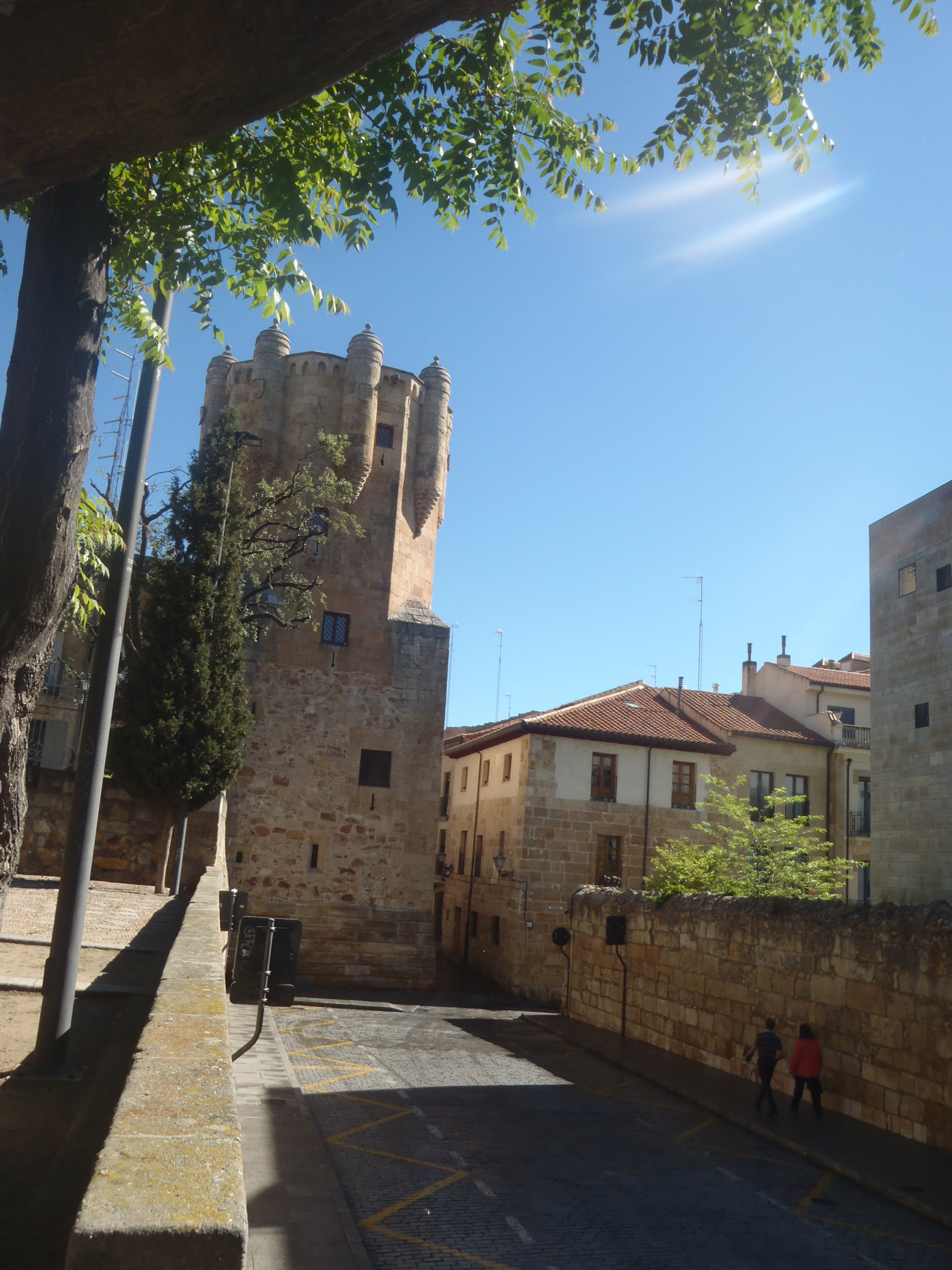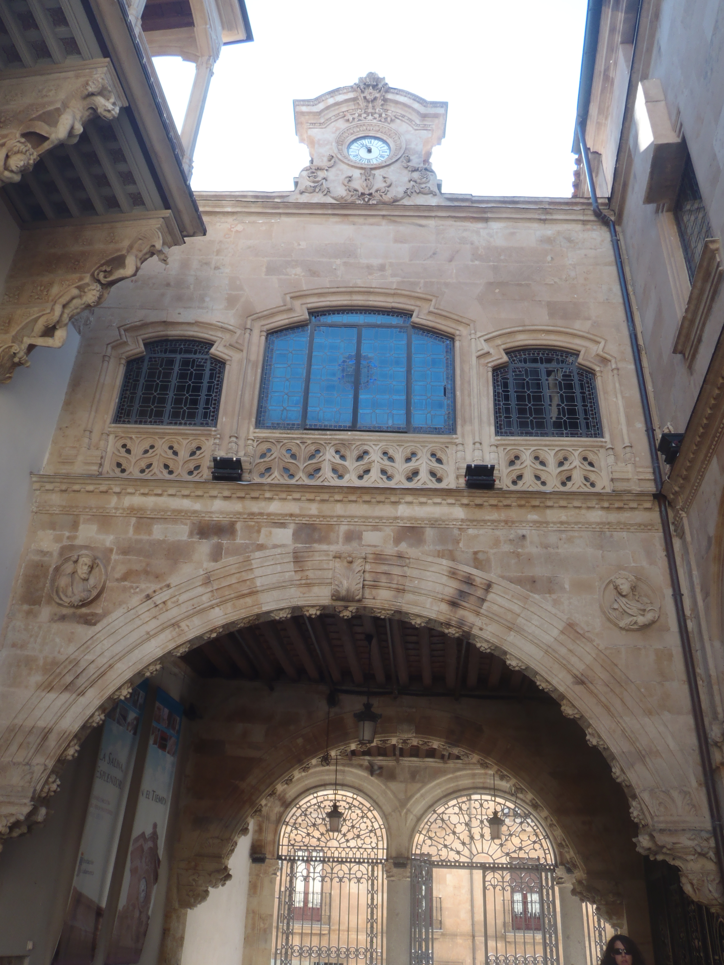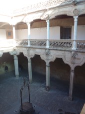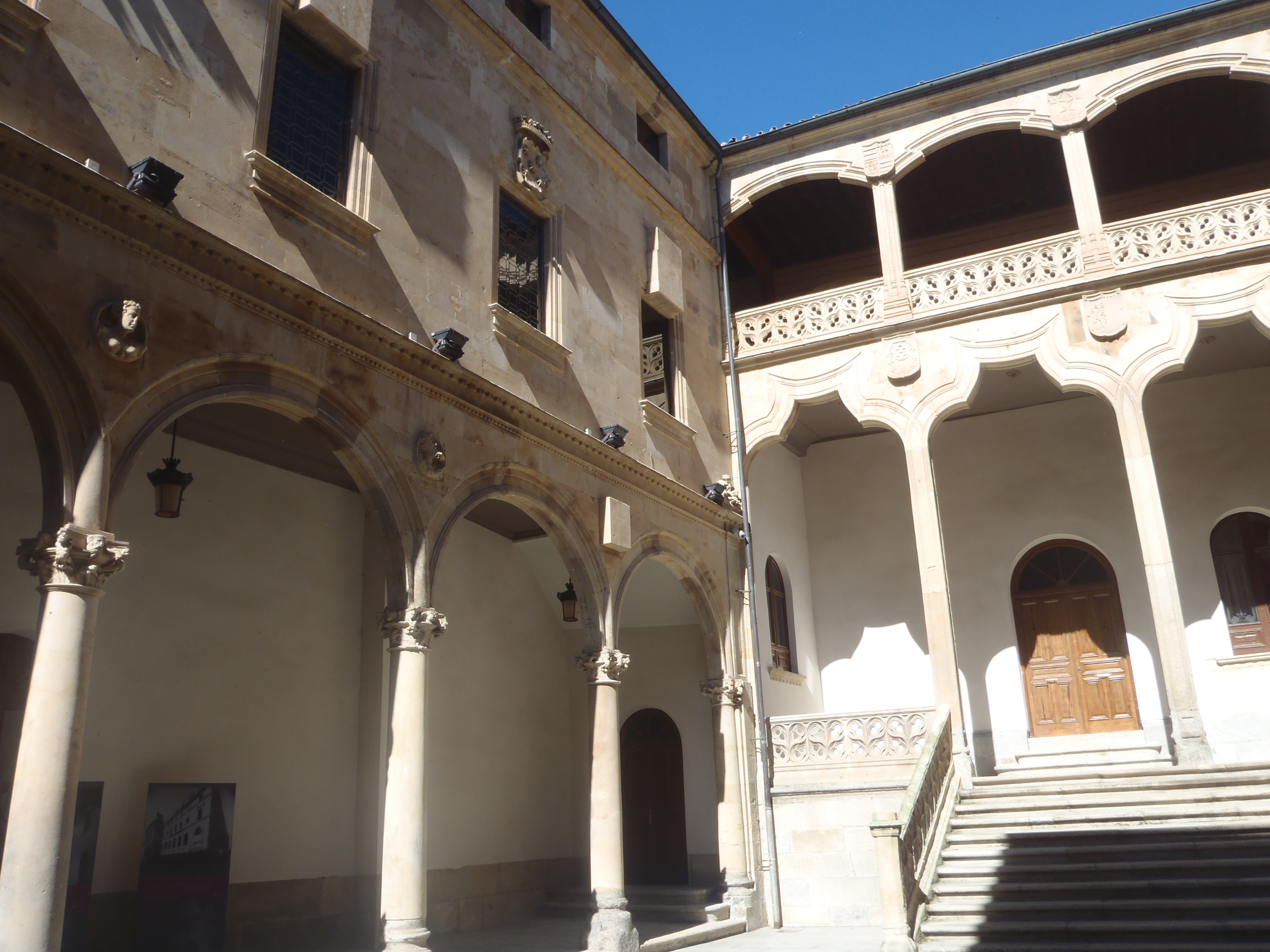 Seguimos por la Plaza Mayor, paseando por el mercado (donde compramos cecina para llevarnos). El edificio estaba en obras, y los puestos estaban trasladados a unos locales vecinos. Continuamos por San Pablo hasta entrar en el claustro de la Diputación Provincial de Salamanca.La Torre del Clavero