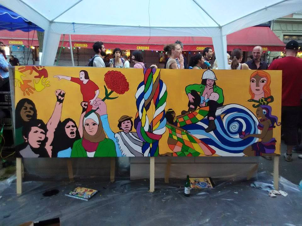 Una de las particularidades de la fiesta es que está abierta a todas las personas: independientemente de su religión, de su idioma, de su nacionalidad, de su cultura. La organización de la misma corría a cargo de la asociación socio-política italiana La Fabbrica di Zurigo, del movimiento Marea Granate Zürich, del que formo parte, del Punto d’Incontro, etc. Para nosotros era la primera vez que participábamos en algo tan grande, pero los maravillosos compañeros de la Fabbrica hicieron que todo fuera mucho más fácil. Nos estuvimos reuniendo los jueves en el Punto d’Incontro desde hacía unos seis meses, utilizando como idioma vehicular el inglés y el italiano. No sólo nos dedicábamos a trabajar, a pensar, a buscar grupos de música, a diseñar los logotipos, a preparar la publicidad; también disfrutábamos compartiendo unas cervezas y unos riquísimos platos de pasta o de risotto cocinados por una gran mujer, por Cuki.