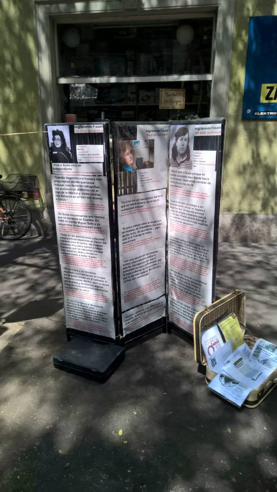 El papel (además de colaborar como voluntarios) que tuvimos la gente de Marea Granate Zúrich en esta fiesta fue presentar el proyecto de homenaje a tres mujeres de la primera inmigración que lucharon por los derechos de la mujer y por la integración: Mercedes Álvarez, Ángeles Cueto (nuestra Cuki) y Rosamari do Codesal. Hicimos un panel con fotografías y frases impactantes en alemán y español.