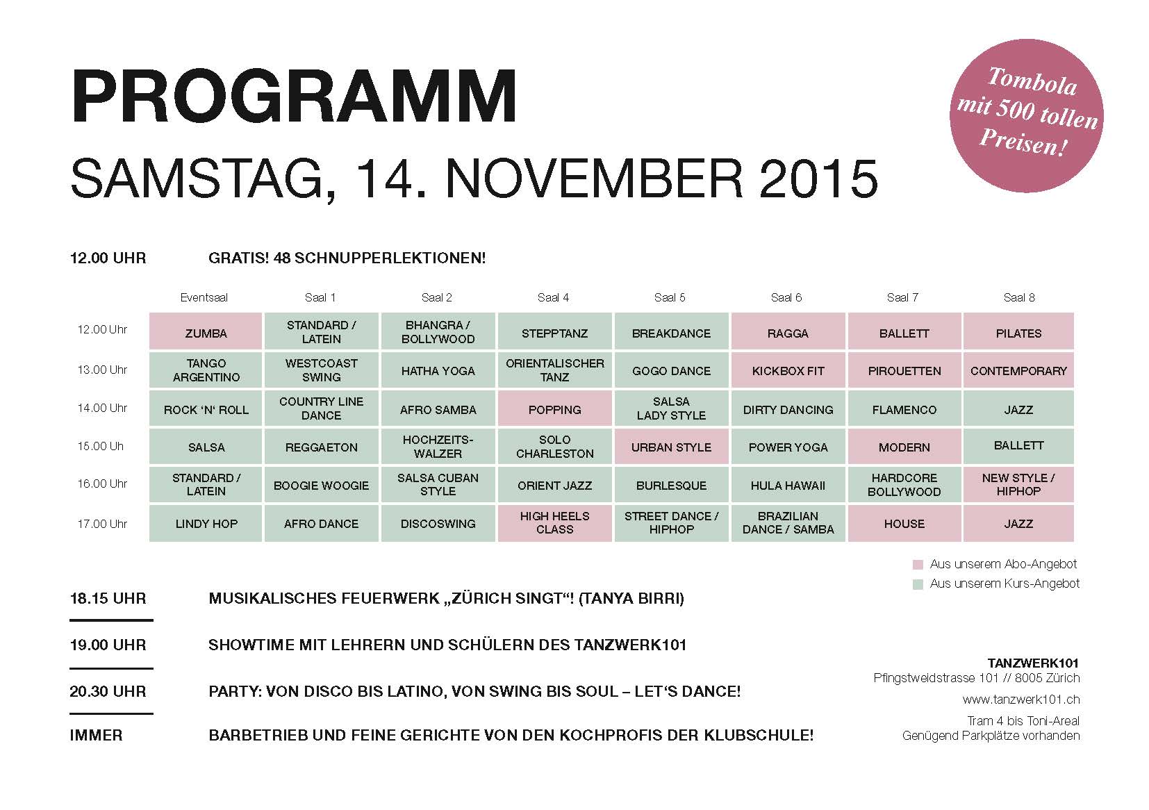 En Tanzwerk101 el sábado 14 de noviembre es el día de puertas abiertas para probar gratis cualquiera de los cursos de baile que ofrecen: hay zumba, salsa, lindy hop, flamenco, etc. Además con fiesta, gastronomía (cocinarán los profesores de la Klubschule) y espectáculo con fuego y una muestra de lo que otros alumnos han aprendido ya.