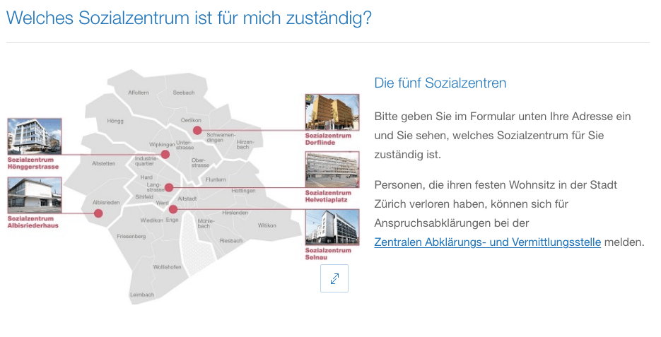 Si necesitas ayuda económica, una opción es contactar con tu centro social. La ciudad de Zúrich anunció que en el caso de quiénes trabajen de forma autónoma (selbständig Erwerbende) o quiénes tengan un salario por hora (Angestellte im Stundenlohn), existe la posibilidad de solicitar asistencia social económica y así poder seguir asegurando el sustento. Existen cinco centros sociales de la ciudad de Zúrich que siguen abiertos y ofrecen apoyo y asistencia. El proceso es el de mirar en qué barrio vives y cuál te corresponde. Tienes que llamar a su número de teléfono y concertar una cita.
