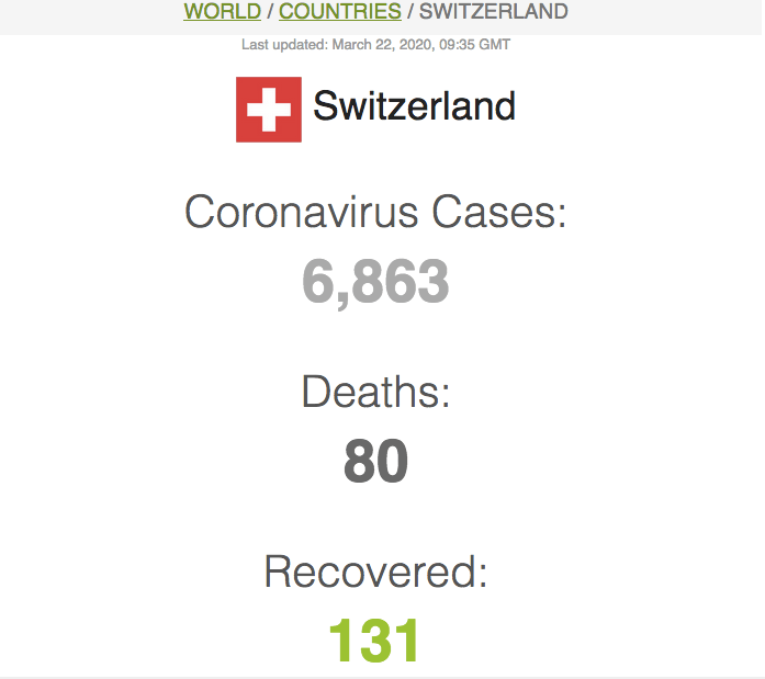 Las cifras de hoy, domingo 22 de marzo, hablan de 60 personas fallecidas a causa del Coronavirus en Suiza y 7.014 personas que han dado positivo en el test. Sabemos que las cifras de personas contagiadas son muchas más, porque no se están haciendo pruebas a todas las personas que contactan con los síntomas.
