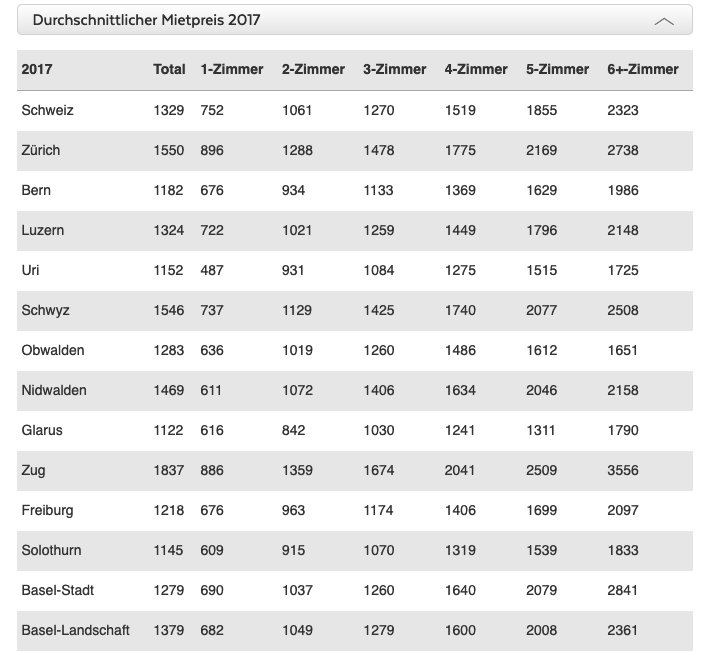 Os copio el extracto de una tabla con el promedio de precios de alquiler en algunos cantones, para que os hagáis una idea aproximada. Aunque recordad que no cuesta lo mismo en la ciudad de Zúrich, que en Wetzikon o en Kloten, ni siquiera dentro de Zúrich, no cuesta lo mismo en el barrio 3 que en el 12. Fuente HEV