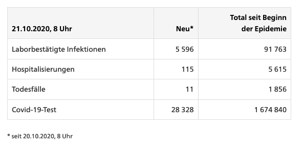 Varios cantones son los que han decidido tomar las medidas más duras contra la propagación del coronavirus. Los cantones de Basilea (ambos) toman medidas como la prohibición de eventos por encima de las 1.000 personas (como ya decidió el cantón de Berna). Soleura (Solothurn) con toque de queda de 1 de la madrugada a las 6h en bares, discotecas, etc. Valais (Wallis): obligación de llevar mascarillas dentro de las oficinas sean públicas o empresas privadas, prohibición de eventos-encuentros de más de 10 personas, cierre de locales de baile, discotecas, teatros, piscinas, gimnasios. Y los restaurantes, bares y cafés con un máximo de 4 personas por mesa y toque de queda a las 22h.