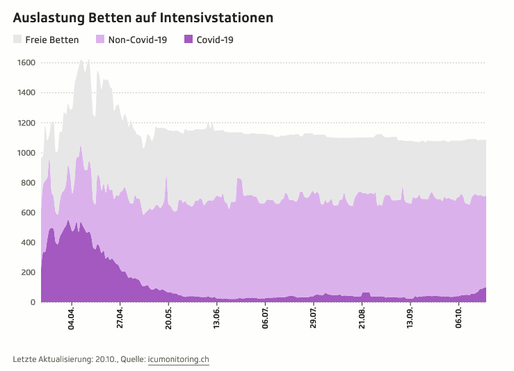 - El dato tranquilizador es que en toda Suiza hay unas 1.000 camas de UCI con posibilidad de ventilación en unos 150 hospitales. Con las reservas, se dispone de un máximo de entre 1500 y 1800 plazas disponibles. Un total de 706 plazas están ocupadas, 100 para pacientes Covid. El número ha aumentado una vez y media (por 1,5) en los últimos cinco días. El personal de enfermería y medicina con formación específica adecuada siguen siendo suficiente.