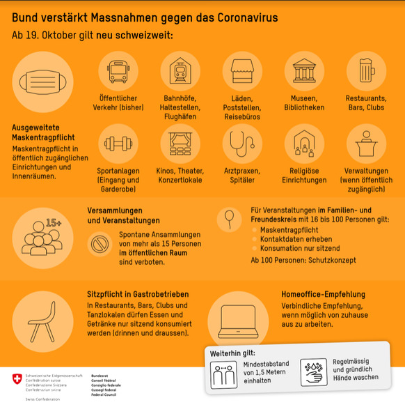En dicha conferencia insistieron en que hay que evitar que el virus se extienda más y que las reglas deben ser seguidas. «Hacer homeoffice (teletrabajo) no es sólo un eslogan», dijeron en el Consejo Federal. El homeoffice debe implementarse siempre que sea posible. Y se nos pide a la sociedad que pospongamos las celebraciones familiares.