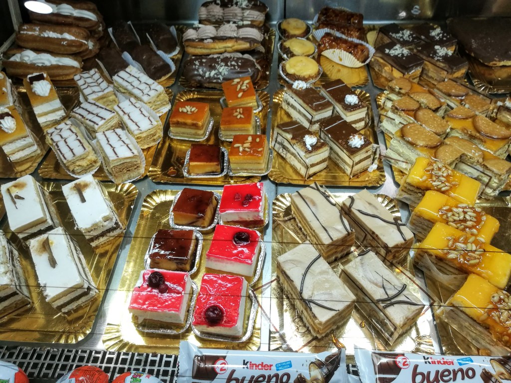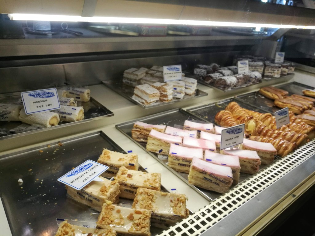 Luego fuimos a comprar torta inglesa (un postre que consiste en bizcocho, relleno de cabello de ángel o de chocolate, con hojaldre, azúcar glas y canela) a la Confitería Las Delicias, pero había tanta cola de gente esperando, que tomamos el coche al polígono y compramos una en la panadería de la Calles Ebanistas. No hice ninguna foto de las tortas inglesas, porque te las hacen el momento con lo que les pidas, pero sí de las palmeras que tenían una pinta deliciosa: