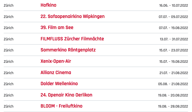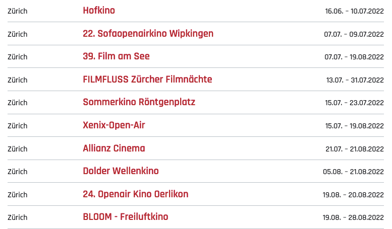 La web de Outnow ha preparado un listado de todos los openair de cine de Suiza. En Zúrich no podemos quejarnos, que tenemos muchísimos: como el Xenix, el de Filmfluss en el Unteres Letten, el Hofkino, etc. Hay en julio y en agosto.