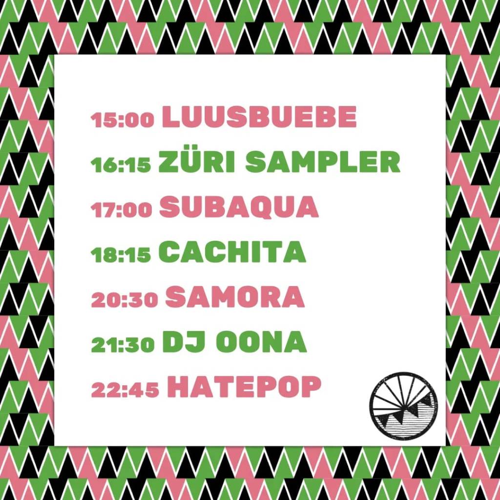 Viernes 29 de julio en el escenario exterior, en el lago en la Rote Fabrik: Magda Drozd y Noémi Büchi con música electrónica. Sábado 30 de julio en Stadionbrache Hardturm: el punk de OneTwoThree y el rock-garaje de Batbait. Jueves 4 de agosto en Sihlhölzli Park el postpunk de District Five y el pop de Andrina Bollinger. El viernes 5 de agosto toca Pop y R&B con Mercee (en el vídeo) y Naomi Lareine esta vez en Turbinenplatz. Y el sábado 6 de agosto, delante de Helsinkiklub, new wave de Stefanie Stauffacher y pop de Dalai Puma.